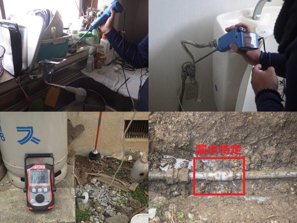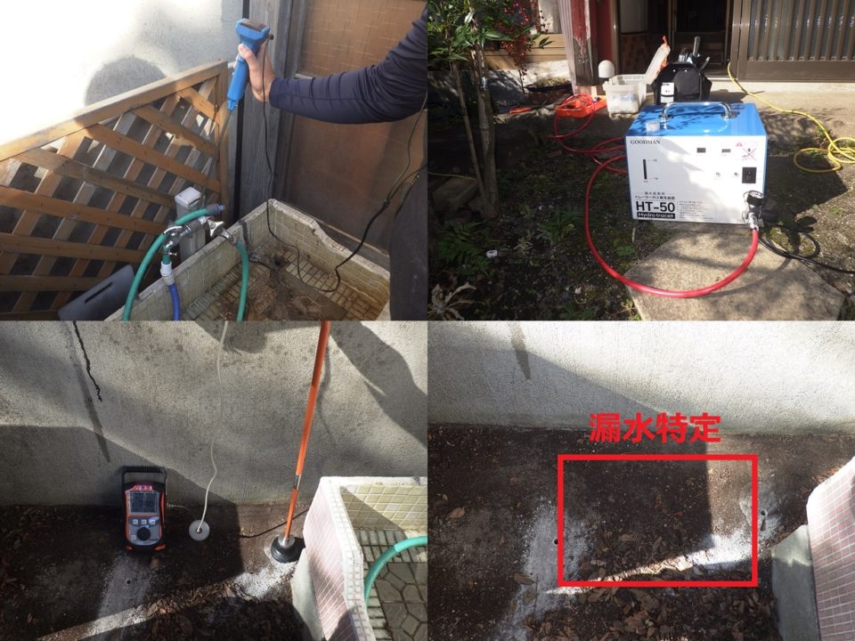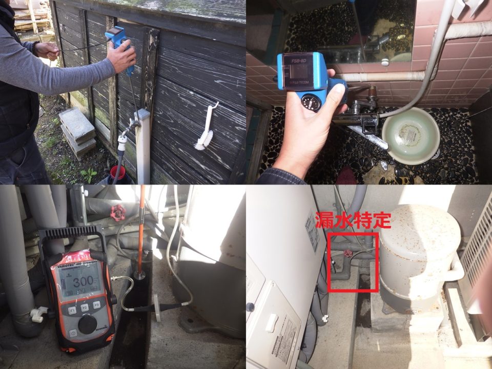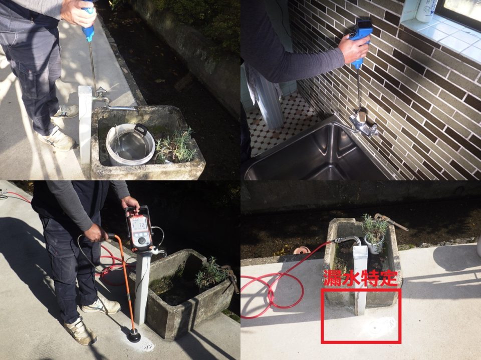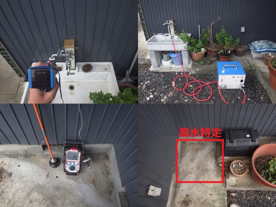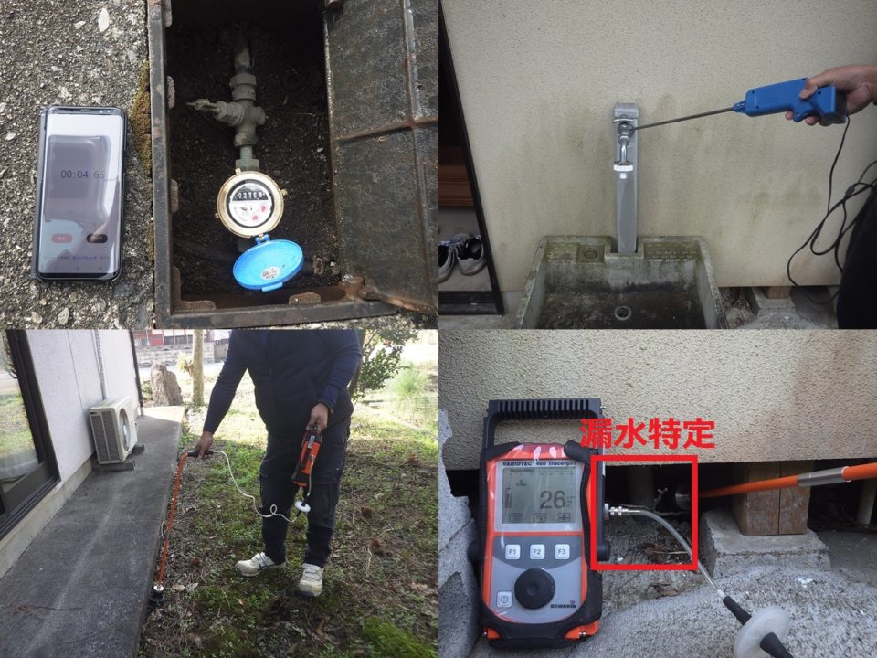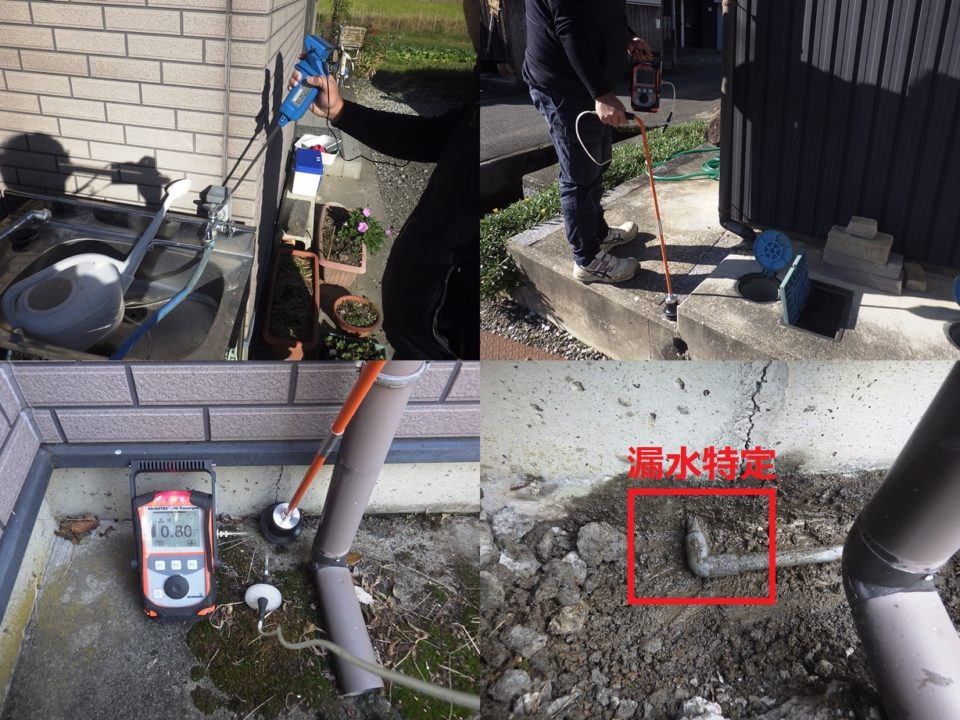 滋賀県長浜市S様邸 一般住宅 戸建住宅の漏水調査 推定漏水量2L/分 漏水量が多かった為、複数箇所の漏れを想定し広範囲に調査しました。 音聴~トレーサーガス調査実施。 屋外の土部分よりピンポイントで漏水特定しました。