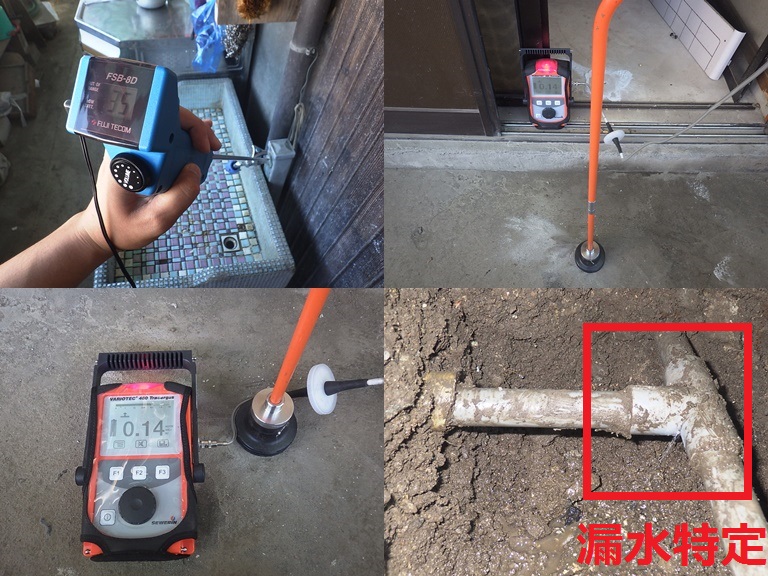 漏水量0.1L/分。 屋内土間コンクリートよりトレーサーガスを検知。 漏水を特定致しました。