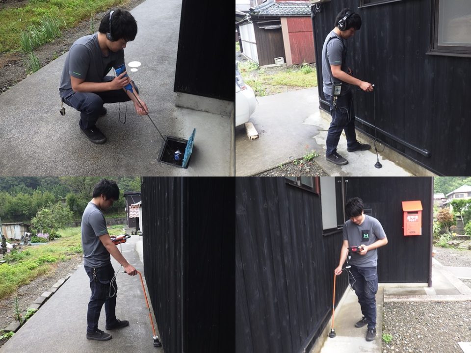 漏水量0.4L/分 屋外コンクリート土間下より反応を検知。 漏水箇所を特定しました。