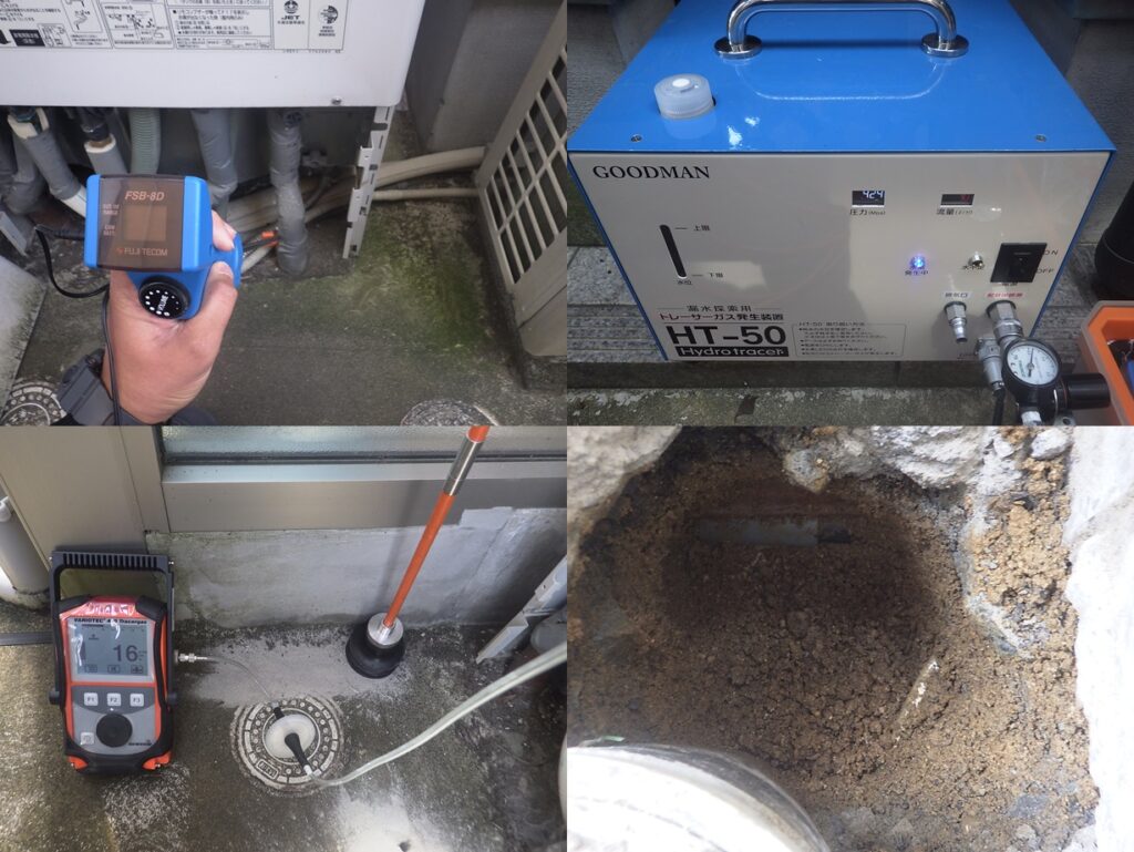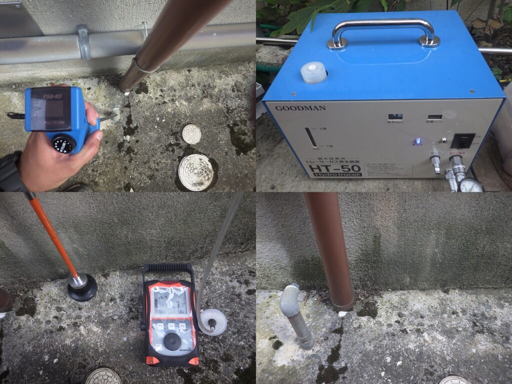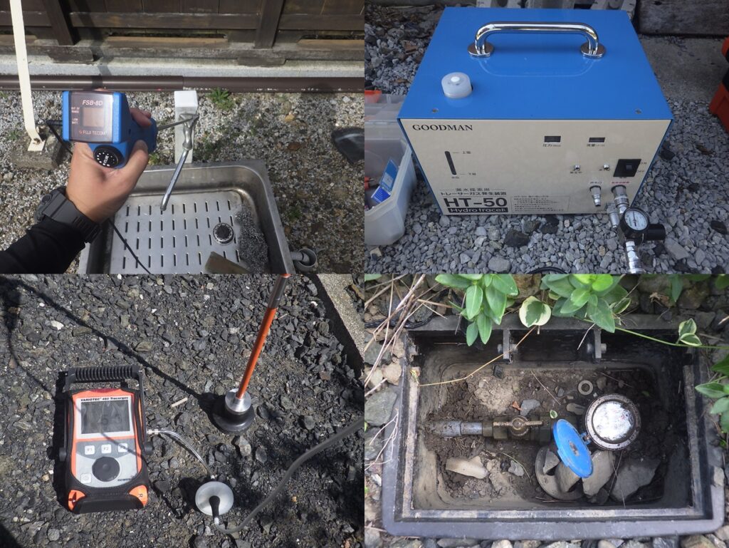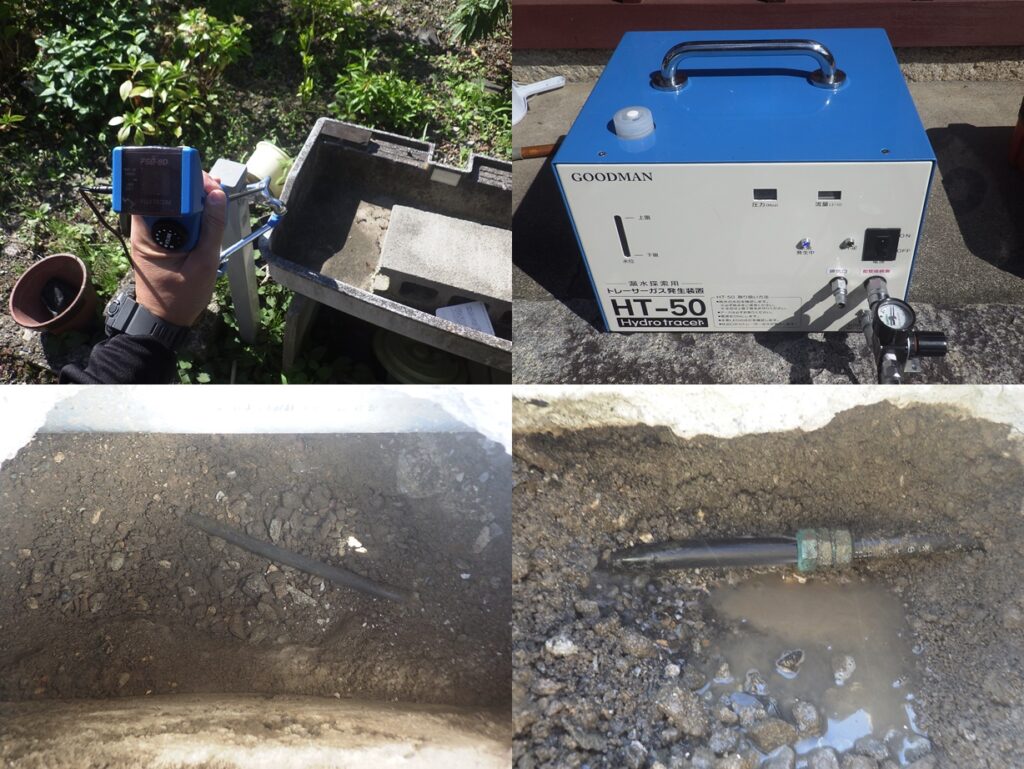 戸建住宅の漏水調査 電子音聴調査、TG工法より調査開始。 屋外にてガス反応を検知。 漏水個所を特定しました。