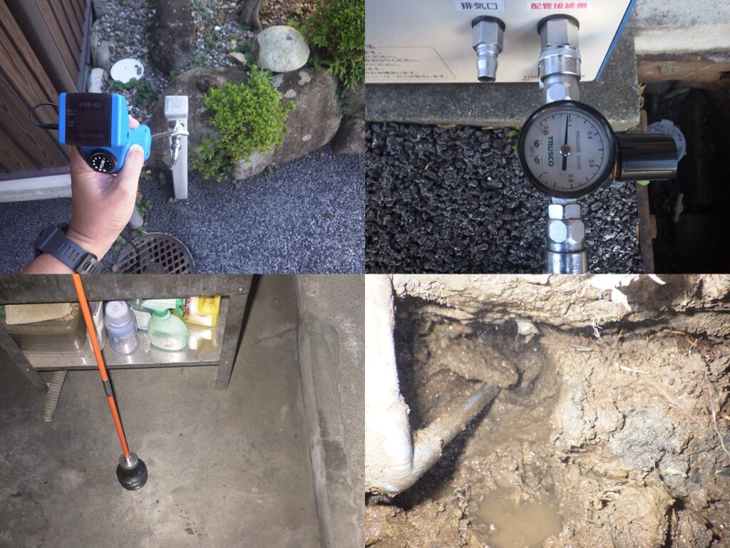 戸建住宅の漏水調査 電子音聴調査、TG工法より調査開始。 音聴調査にて浴室、洗面所より反応を検知。 床下配管より漏水個所を特定しました。