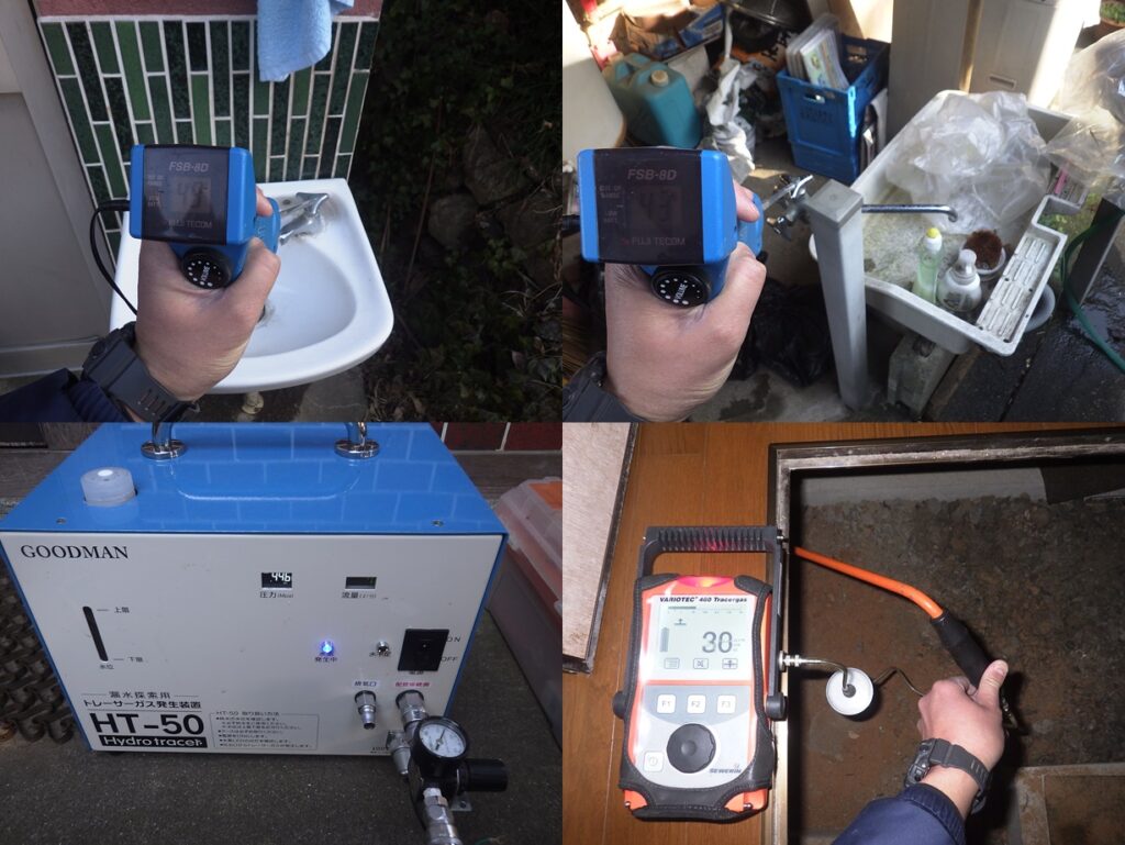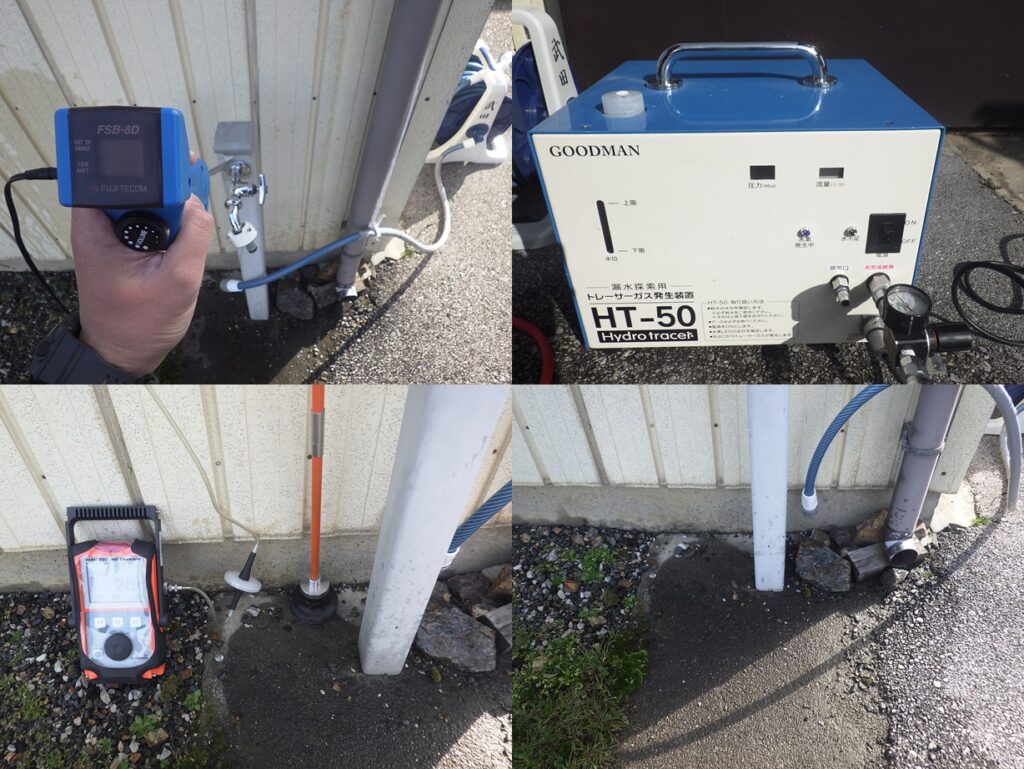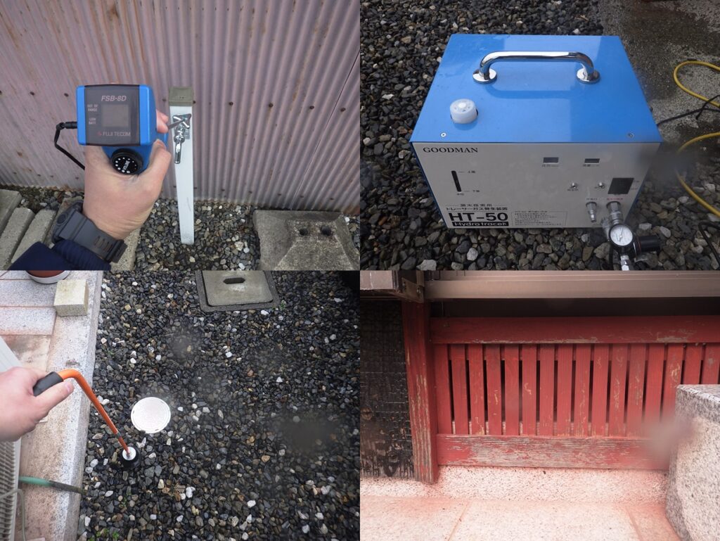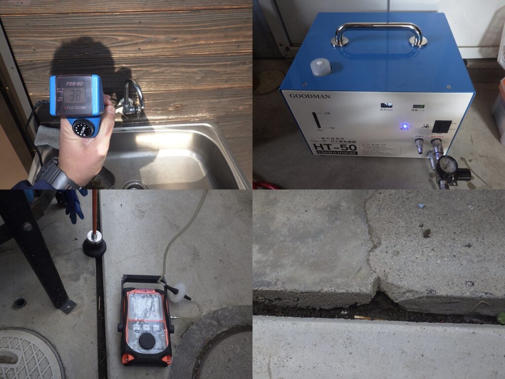 戸建住宅の漏水調査 電子音聴調査、TG工法より探索開始。 屋外立水栓よりガス反応を検知。 漏水個所をピンポイント特定しました。